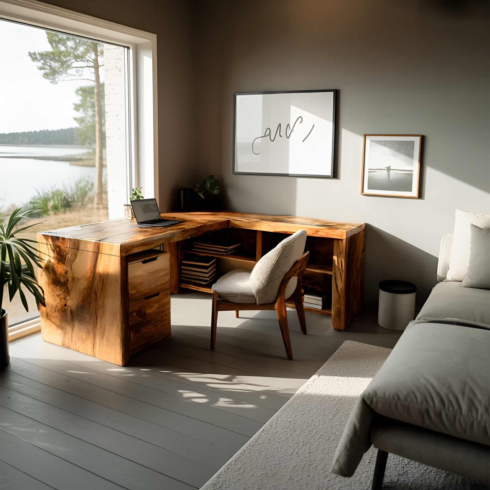 This L-shaped workstation desk features a refined silhouette with a continuous wooden top that flows naturally across both sides. Functional open shelving maximizes storage for books and essentials, while the side drawers help maintain a tidy workspace. The extended corner configuration offers generous room for laptops, documents, and table lamps, enhancing overall usability.
