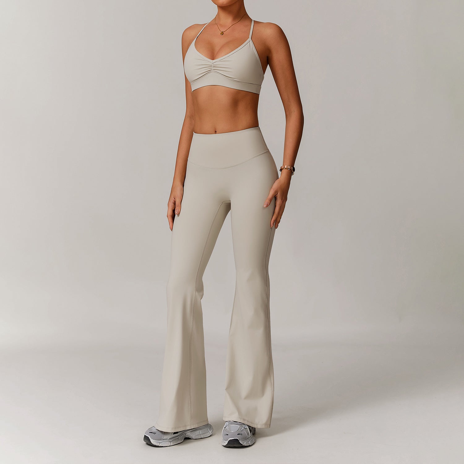 Crafted from a buttery-soft stretch blend, this set moves with you and breathes like a second skin. The flared bottom adds a touch of movement while the ruched top with removable cups keeps you secure through every stretch and step.