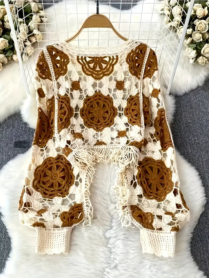 Crafted from pure cotton yarn, this open-knit piece features floral medallion panels with a bold, earthy contrast. Delicate fringe trim and hand-crocheted loops give it a breezy charm perfect for layering over lightweight staples.