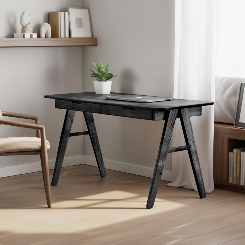 This desk features tapered legs with a subtle A-frame structure, paired with a slim desktop and two streamlined drawers for easy storage. The accompanying chair echoes the same refined angles and warm wood tones, creating a cohesive and stylish setup. Its form is minimal yet full of character, making it adaptable to various room layouts.