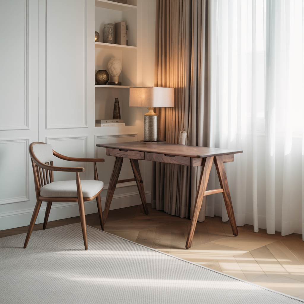 Bring understated elegance to your study space with our Mid Century Modern Wood Writing Desk With Drawers For Home Office Or Study, crafted to balance clean geometry with the inviting warmth of natural wood. Its compact form and thoughtful detailing make it an ideal choice for focused work, reading, or creative projects.
