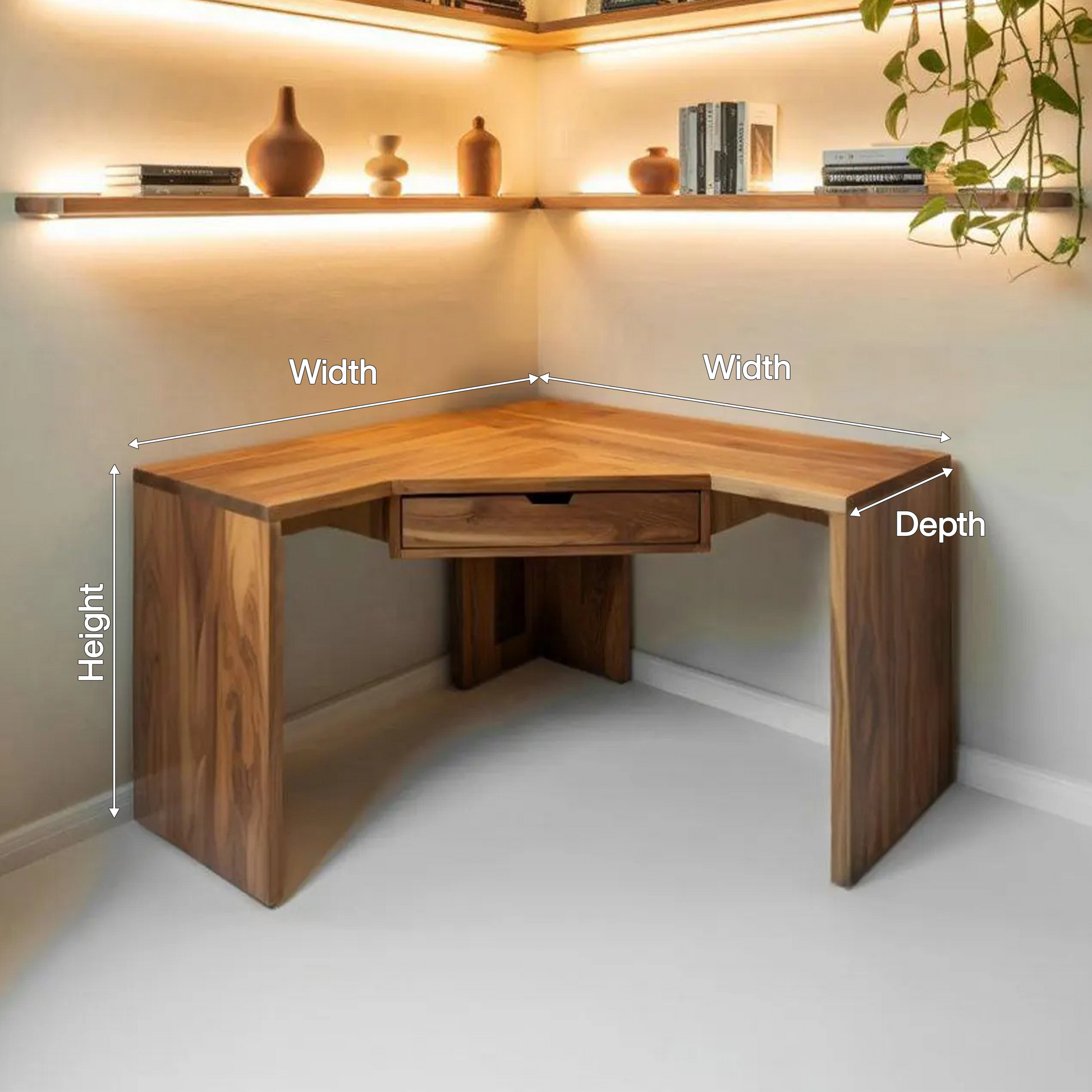 This corner desk features a geometric silhouette with clean, uninterrupted lines that effortlessly fit into tight or awkward spaces. Its V-shaped layout naturally follows the wall’s contours, making efficient use of room corners while still offering a balanced surface area. A slim drawer is discreetly integrated beneath the desktop for convenient storage, maintaining the desk’s clean and uncluttered appearance.