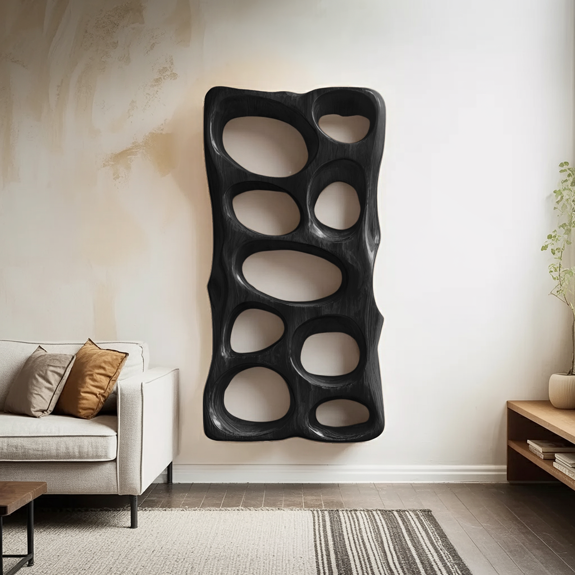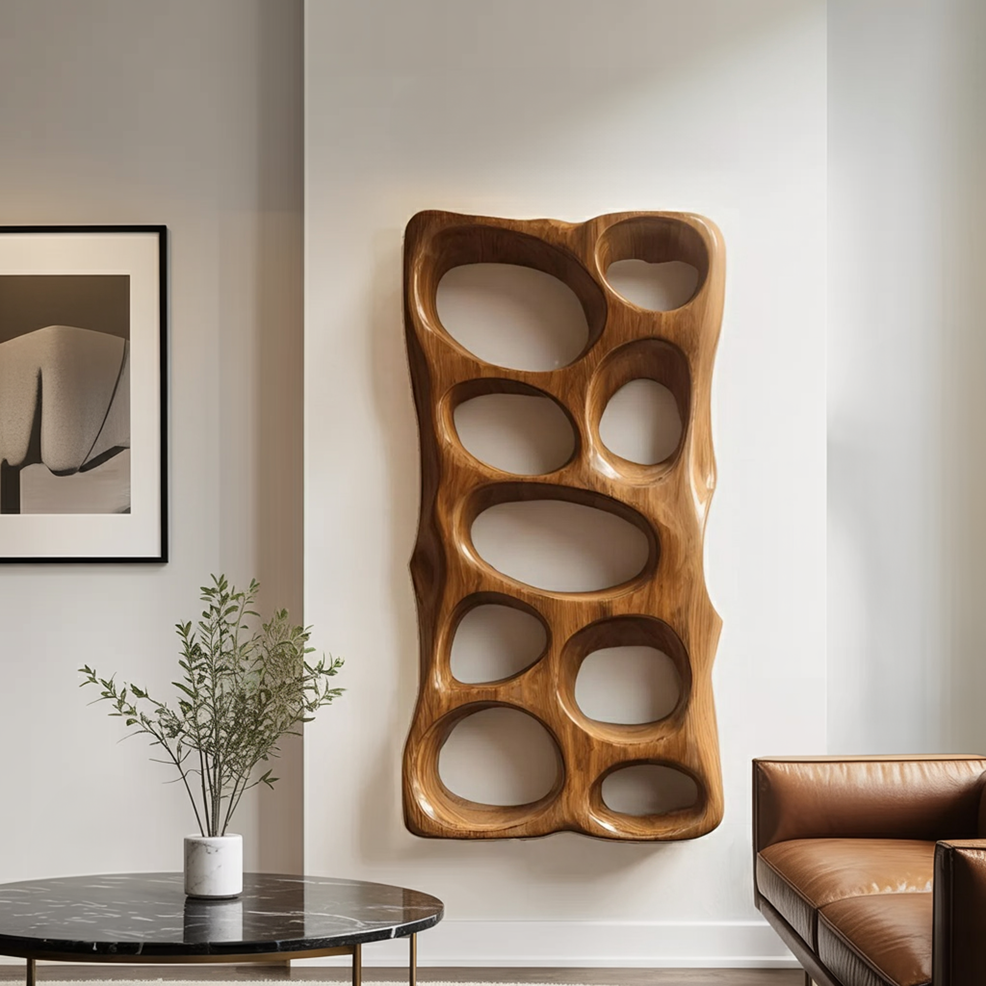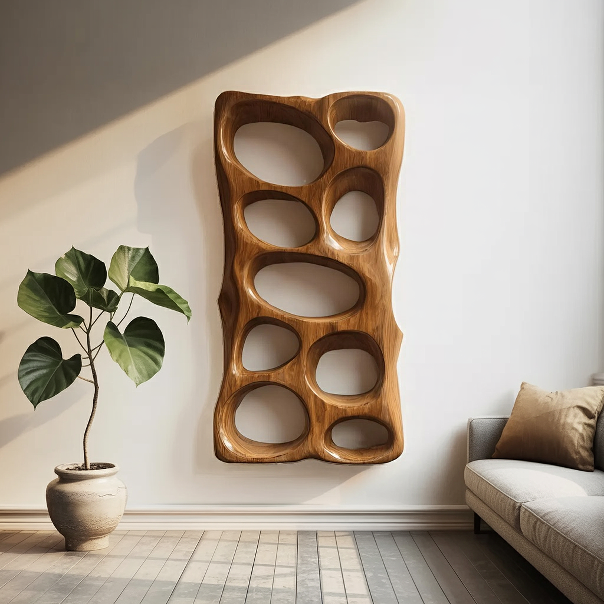 This vertical wall art features a series of smooth, organically shaped openings carved into a continuous wooden form. The soft curves and shifting depths interact beautifully with natural light, casting gentle shadows throughout the day. Its tall, slender silhouette makes it ideal for narrow walls, entry spaces, or large living room layouts that need a strong architectural accent.