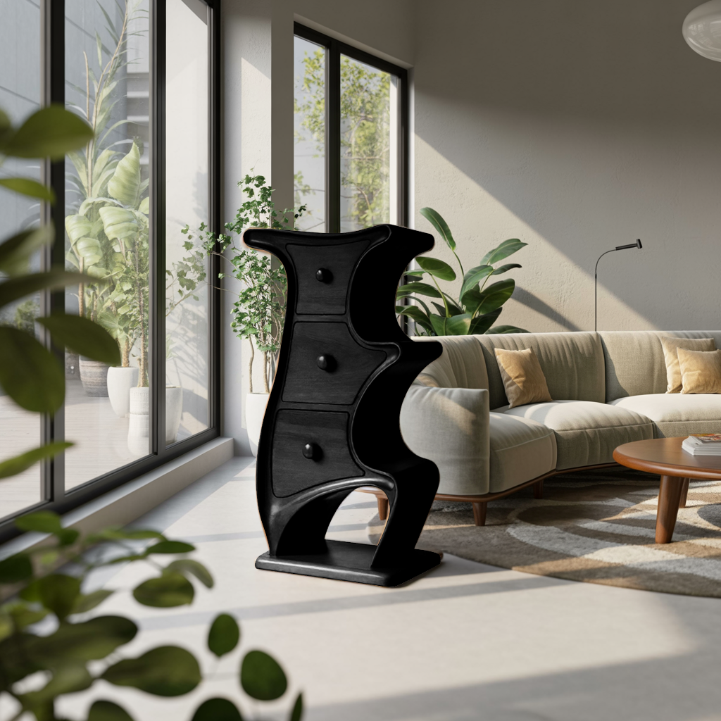 This freestanding piece embraces fluid geometry: three subtly concealed drawers flow seamlessly within an undulating wooden frame, while open niches offer thoughtful display and storage. The organic silhouette appears to float above the floor, lending a sense of lightness and visual harmony to contemporary interiors.