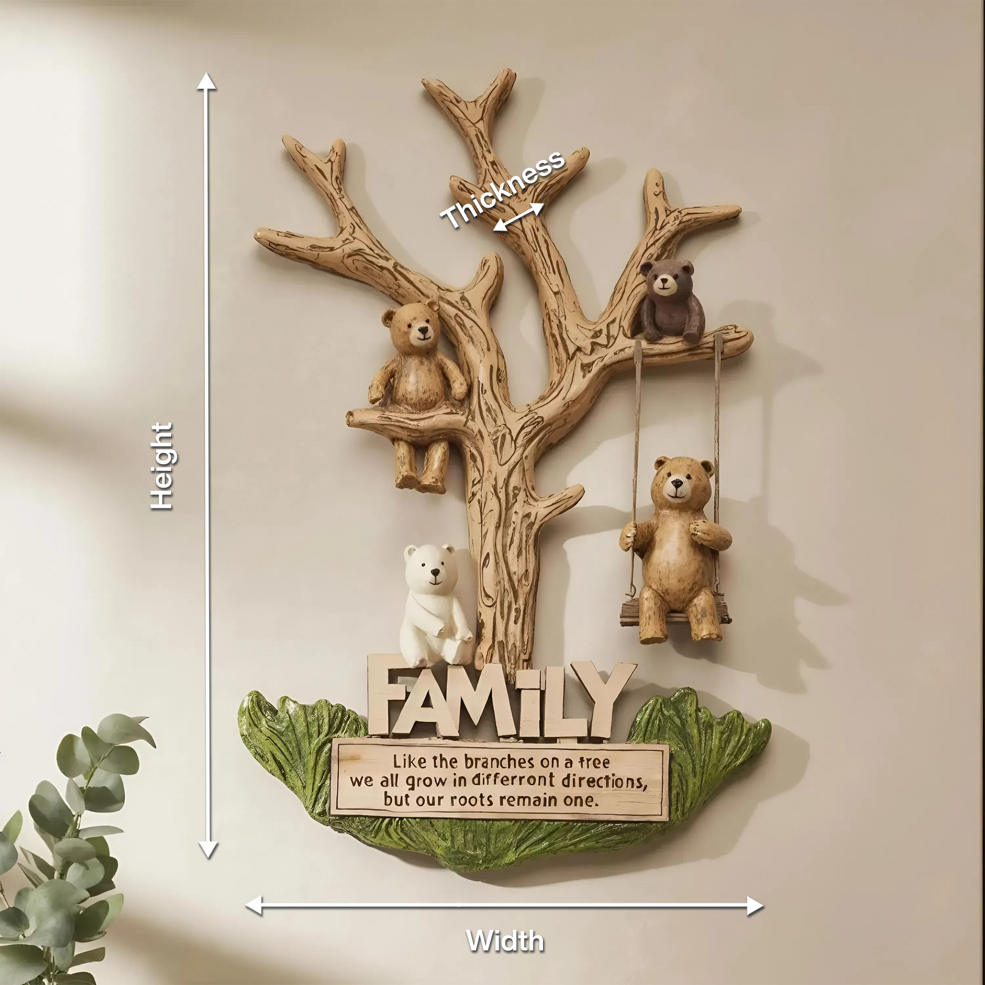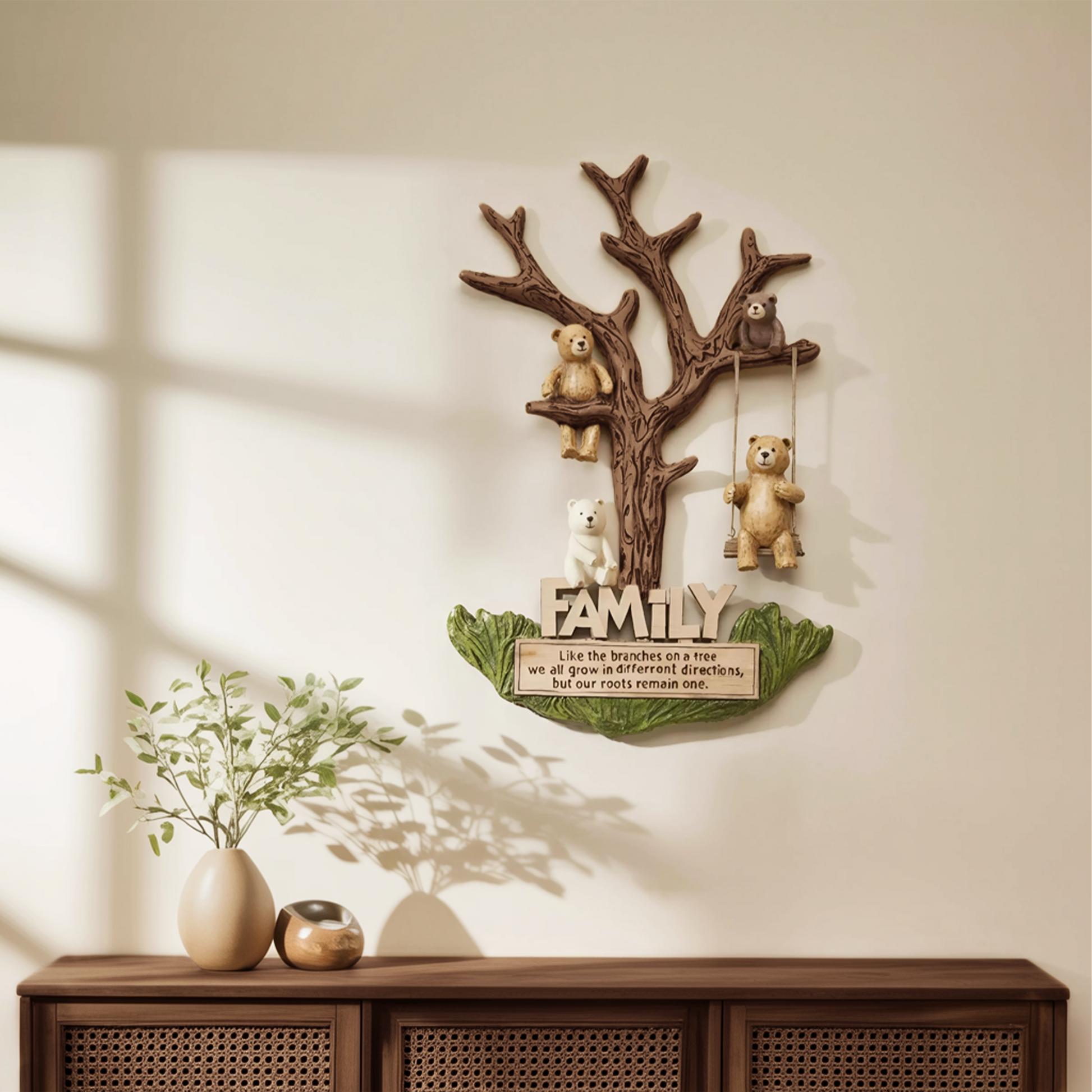 This charming wall sculpture features a tree-shaped frame with lovingly detailed bear figurines perched on its branches — some sitting, others swinging — symbolizing the strength and togetherness of family. Below the tree, a heartfelt quote reinforces its sentimental value, making it both an art piece and a meaningful reminder of connection. The whimsical yet grounded design makes it a delightful focal point in cozy, family-oriented spaces.