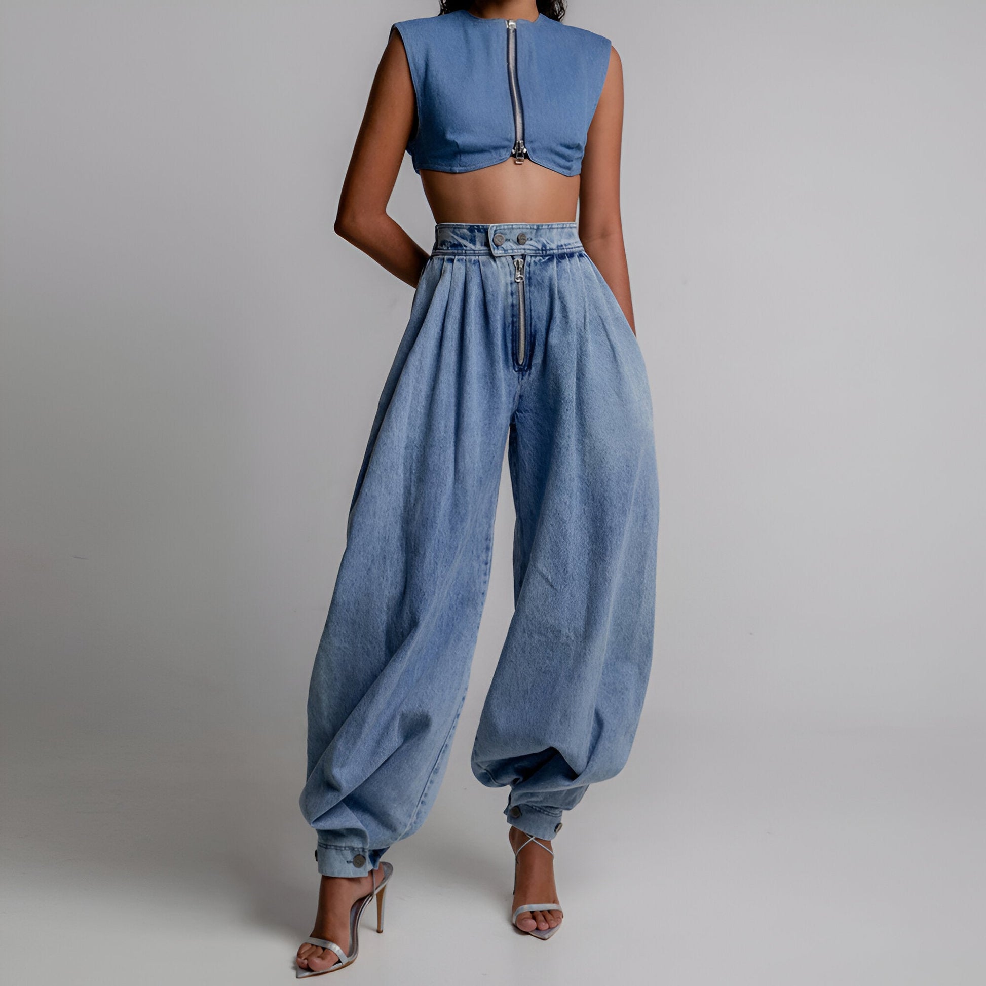 Made from soft-washed premium denim, these high waist balloon pants shape the body with bold volume and deep front pleats. The wide-leg silhouette tapers at the ankle with a snap cuff finish, creating a striking contrast in every step.